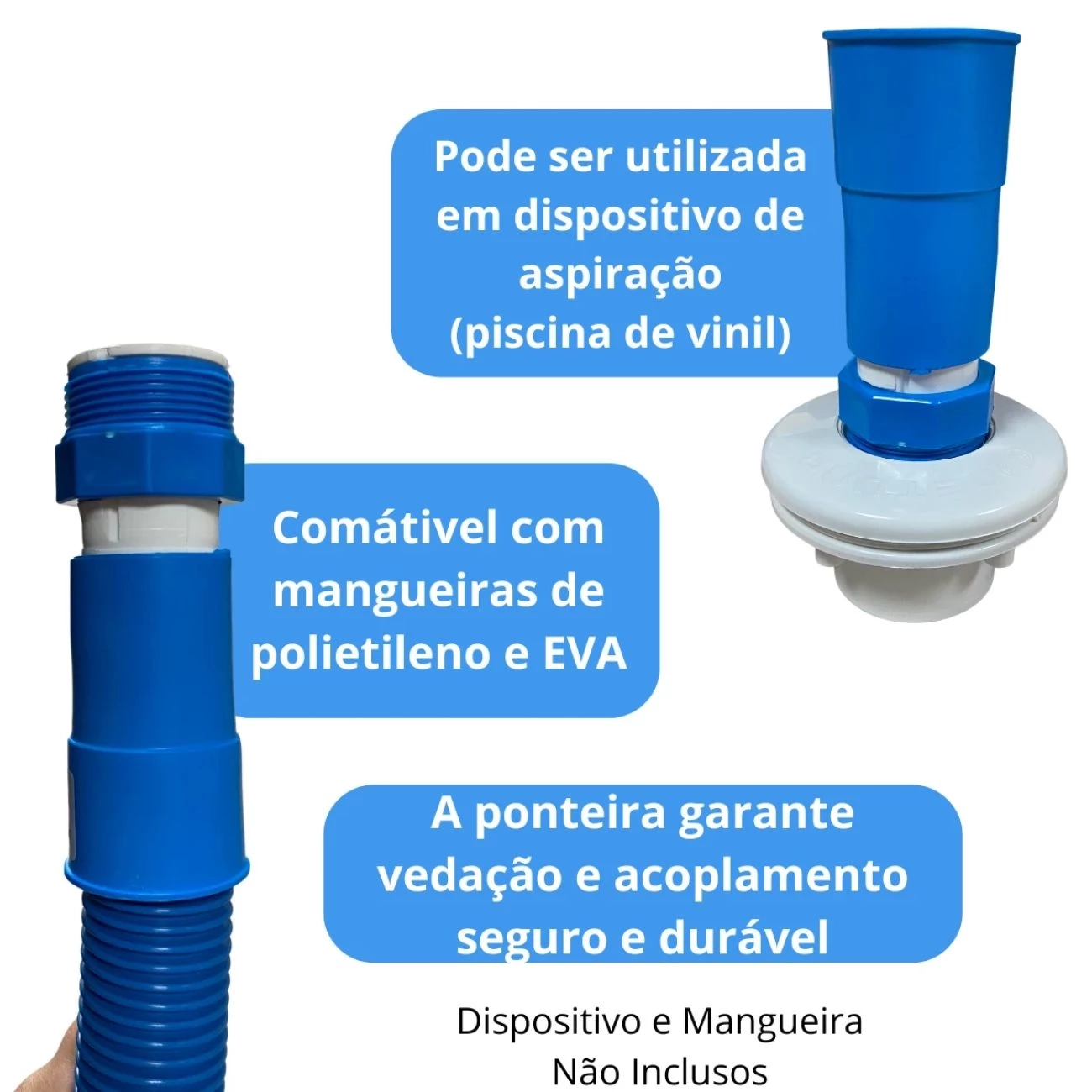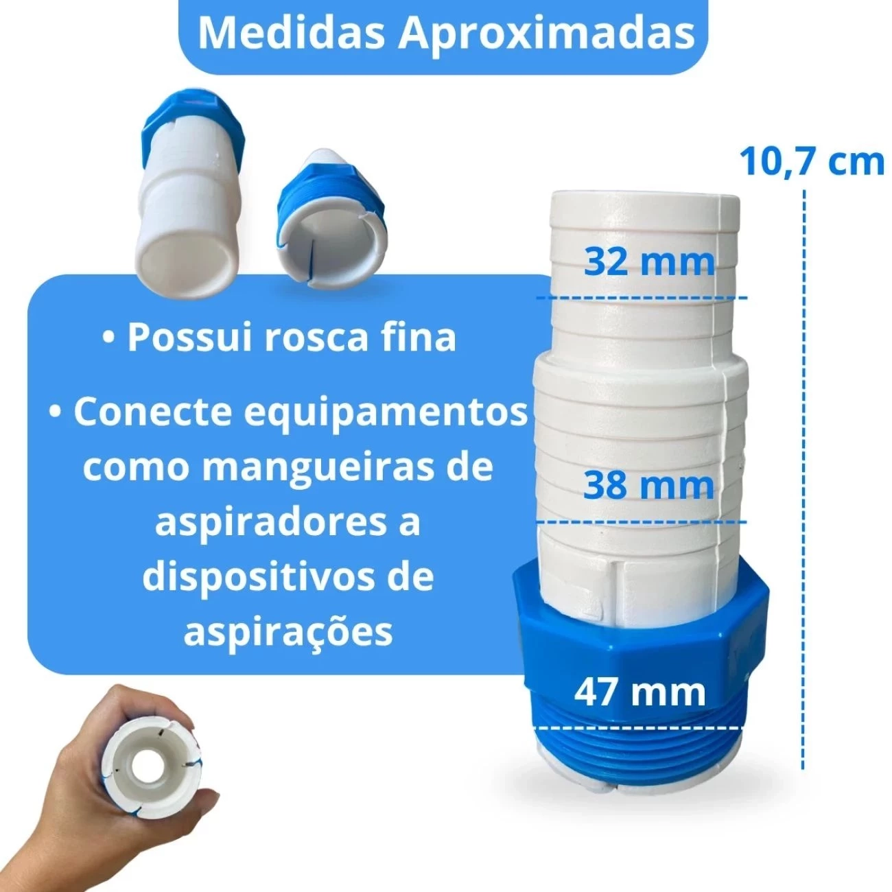 :: Recomendação de uso: Essencial para a limpeza eficiente de piscinas.; Utilize para conectar a mangueira de aspiração ao aspirador ou ao skimmer, garantindo um acoplamento seguro e durável, com vedação eficiente para evitar vazamentos e manter o desempenho ideal do sistema de sucção.