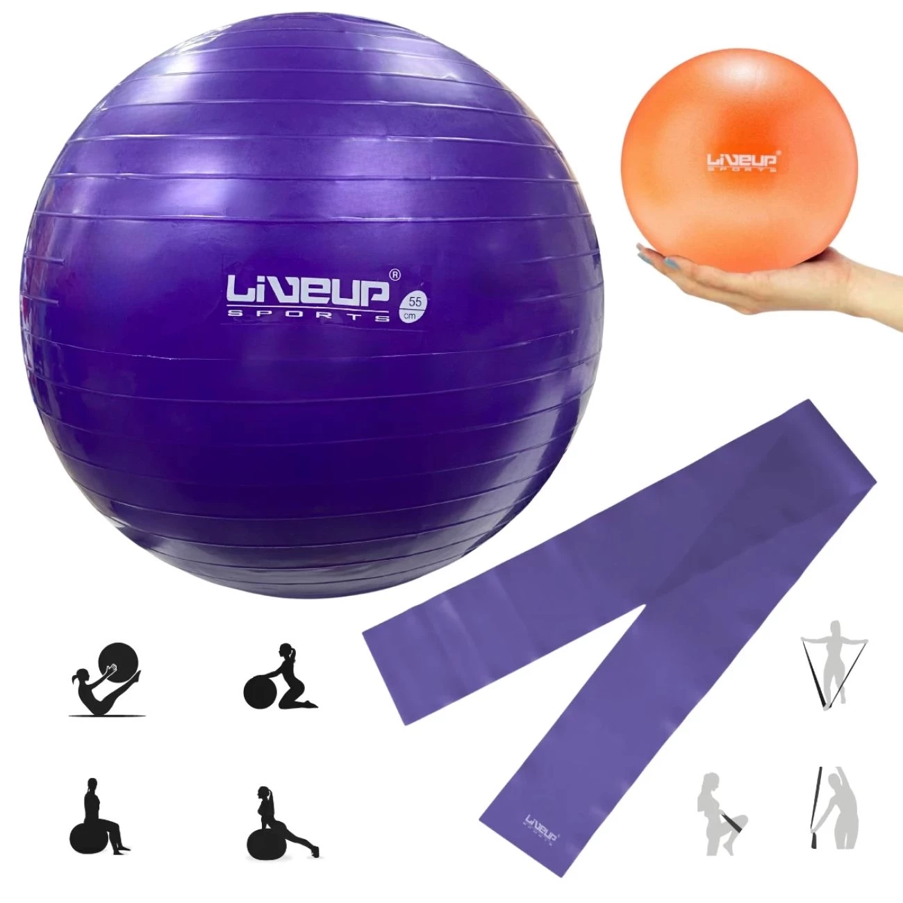 Kit Bola Suíça Roxa 55cm Pilates + Overball 25cm + Faixa Elástica Média Treino Yoga Academia