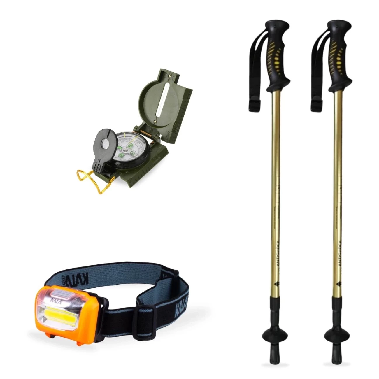 Kit Bússola Alumínio Modelo Militar+ 2 Bastões Caminhada Trilha + Lanterna de Cabeça Led Acampamento
