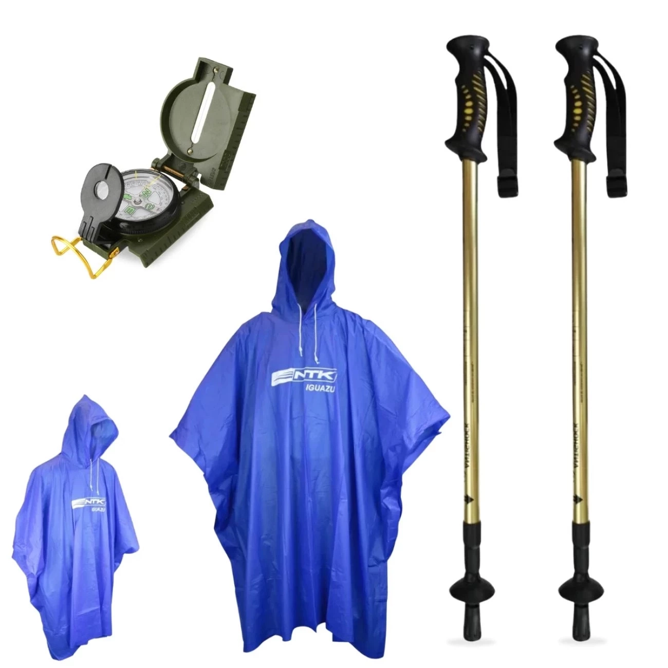 Kit Bússola Indicador Fluorescente + 2 Bastões Caminhada Trilha + Capa de Chuva Poncho Acampamento