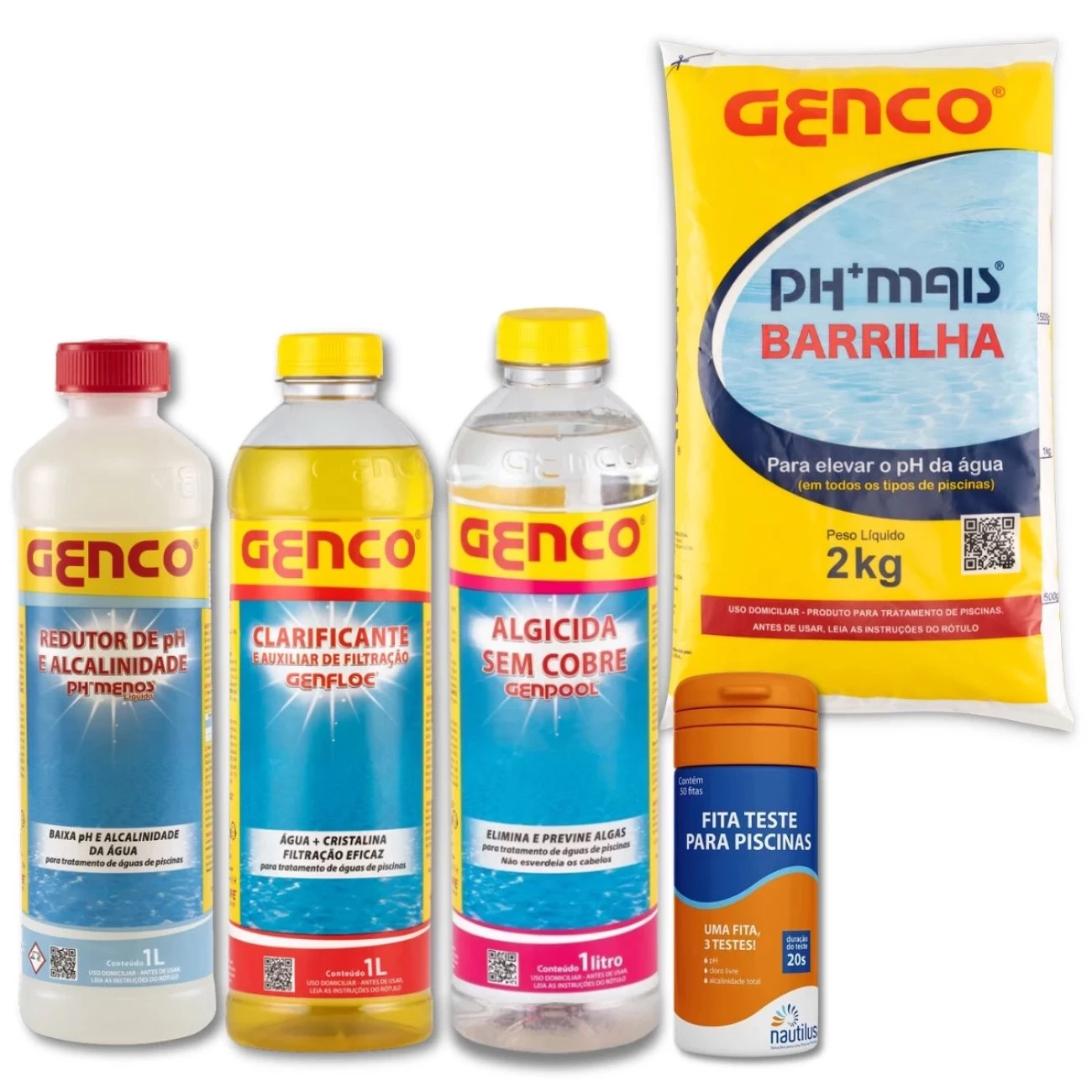 Kit Clarificante + Algicida + Redutor de Alcalinidade + Barrilha + 50 Fitas 3 em 1 Cloro, Ph e Alcalinidade