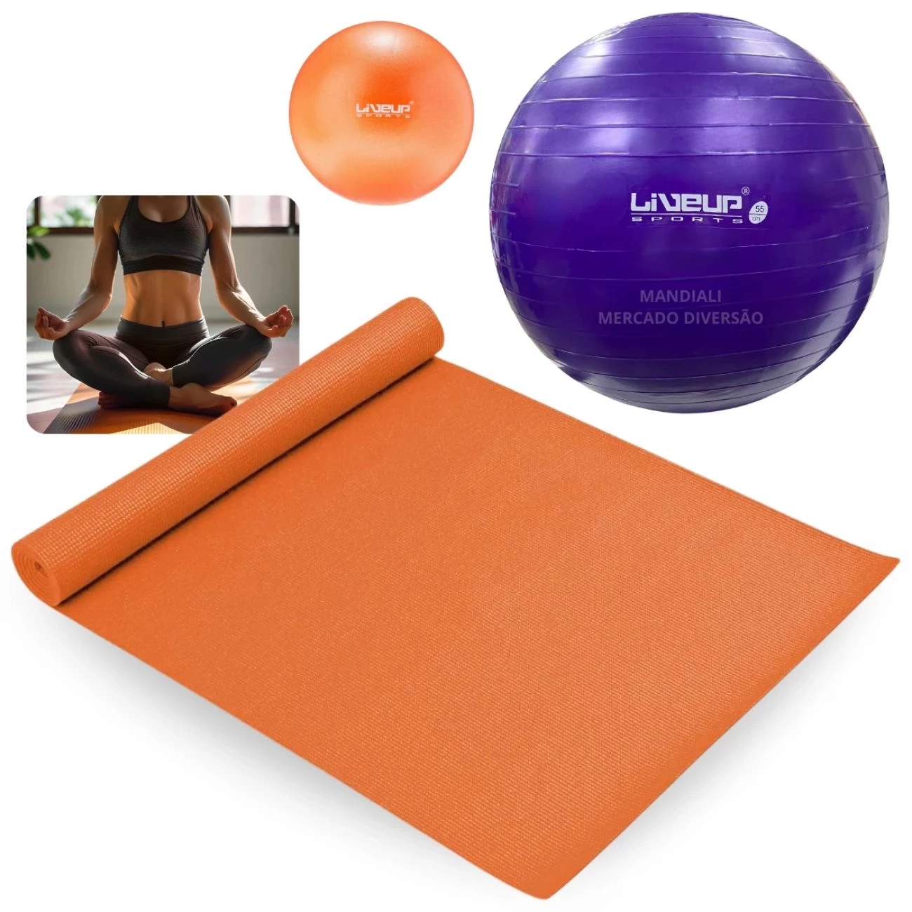 Kit Colchonete para Yoga Laranja 1,73m + Bola de Pilates Suiça 55 Cm + Overball 25cm Exercicios