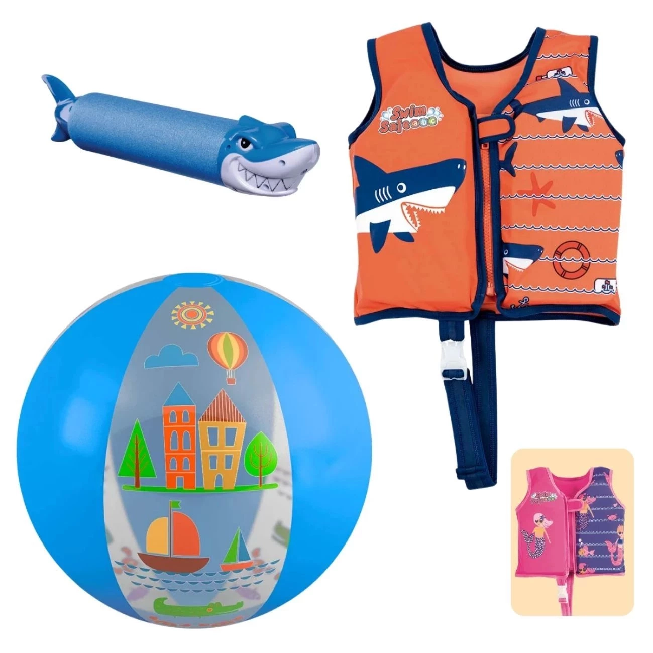 Kit Colete Infantil Natação Tamanho M/G + Bola 40 Cm e Lança Água Piscina Praia