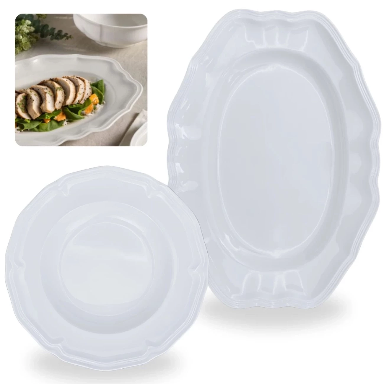 Kit Conjunto 6 Pratos Fundos 22,5 Cm + 2 Travessas 36 Cm Rasas Bordas Decoradas Melamina / Plástico