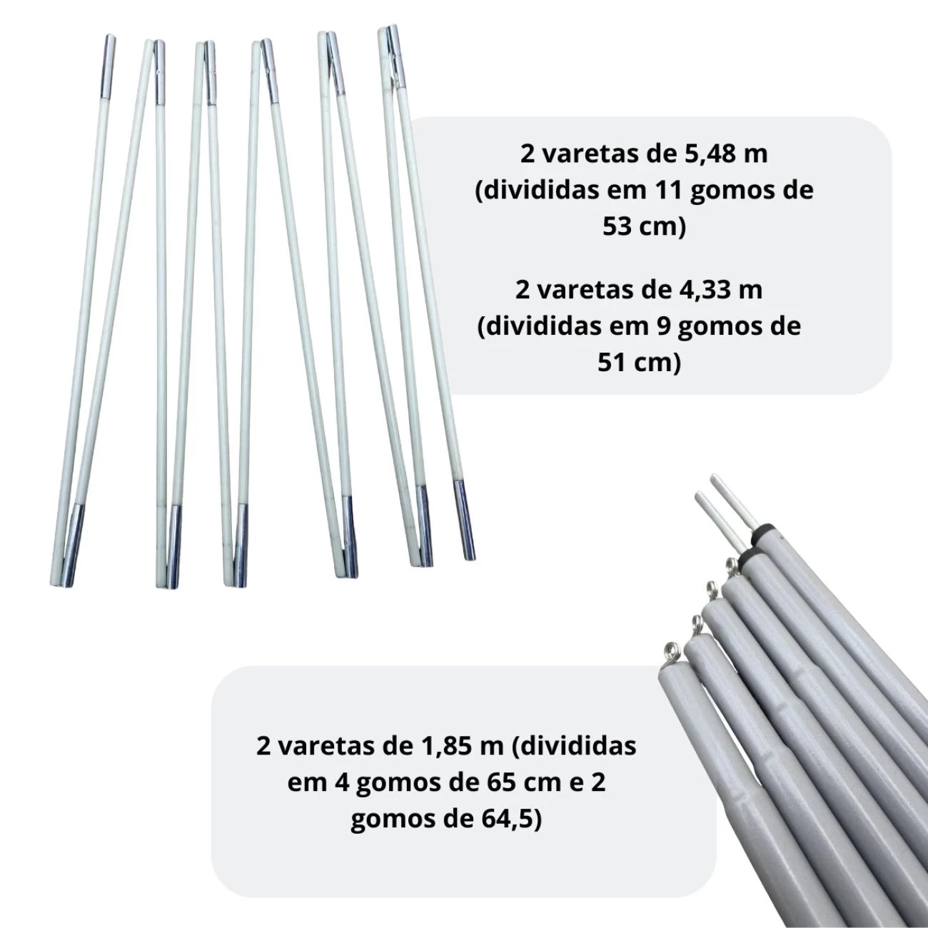 :: Medidas: Aproximadas:; 2 varetas de 5,48 m (divididas em 11 gomos de 53 cm); 2 varetas de 4,33 m (divididas em 9 gomos de 51 cm); 2 varetas de 1,85 m (dividas em 4 gomos de 65 cm e 2 gomos de 64,5 cm)