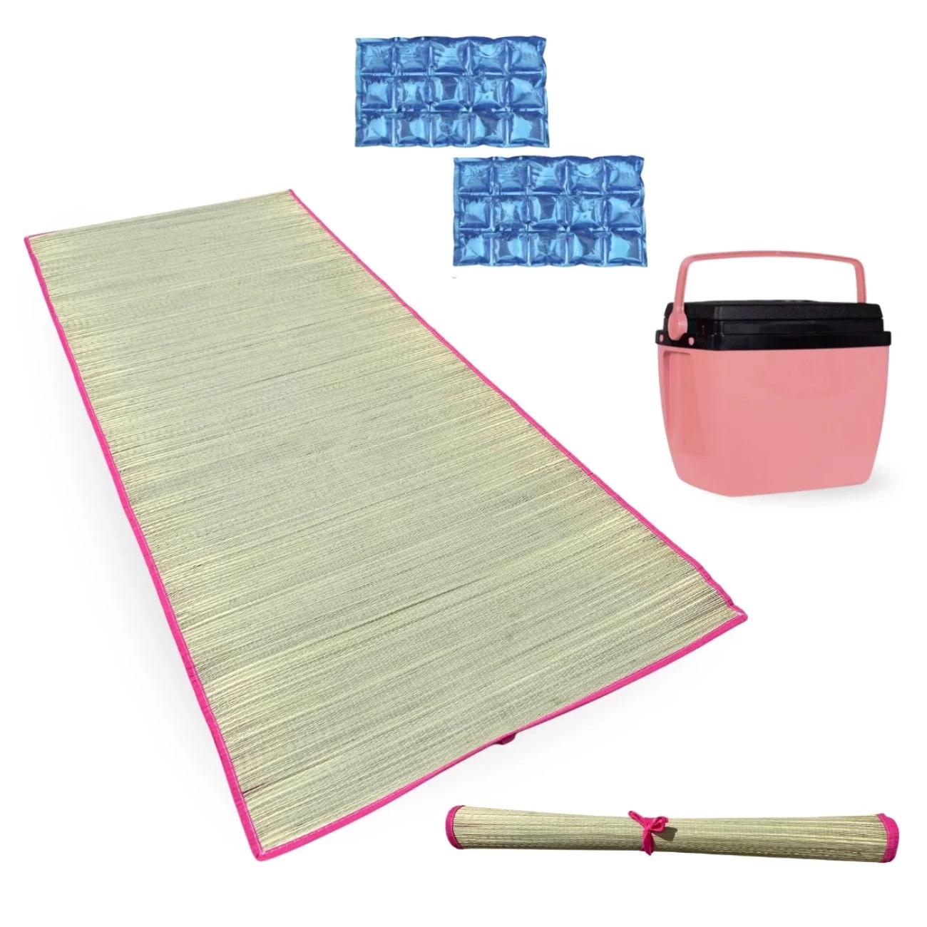 Kit Esteira de Praia Palha 1,80 M X 70 Cm + Caixa Térmica 18 L Rosa + 2 Blocos de Gelo Reutilizável