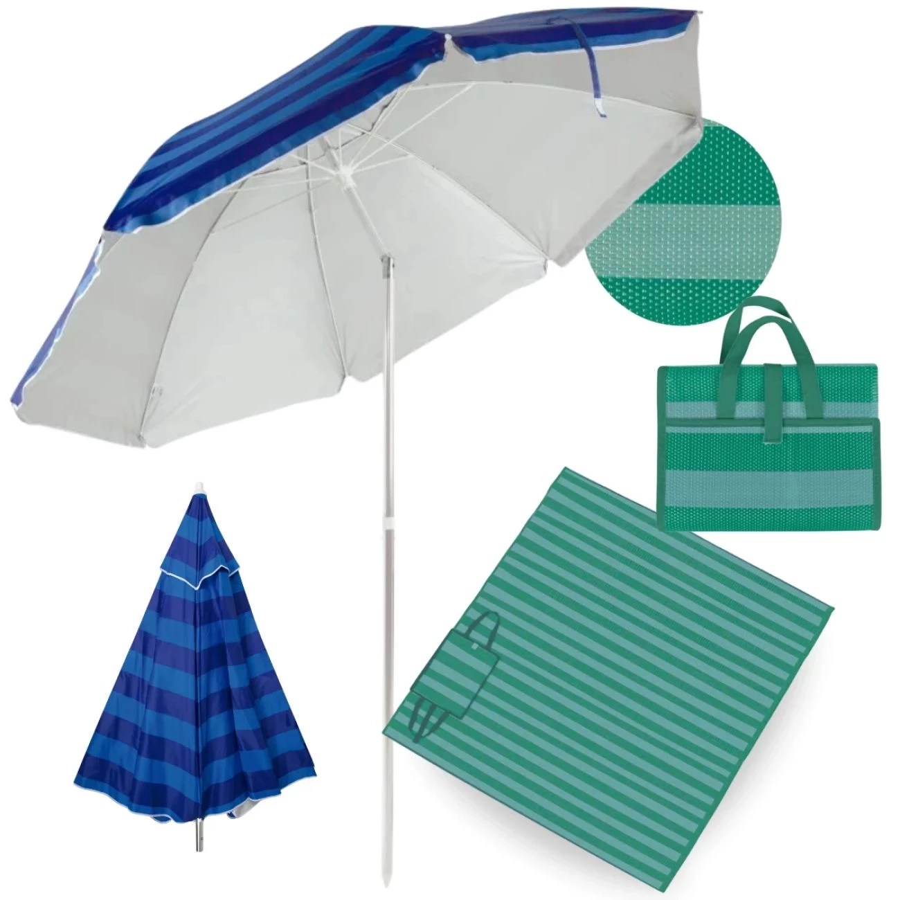 Kit Guarda Sol 2,40m Articulado Azul Listrado + Esteira de Praia Casal Turquesa 2 M X 1,5 M com Alça