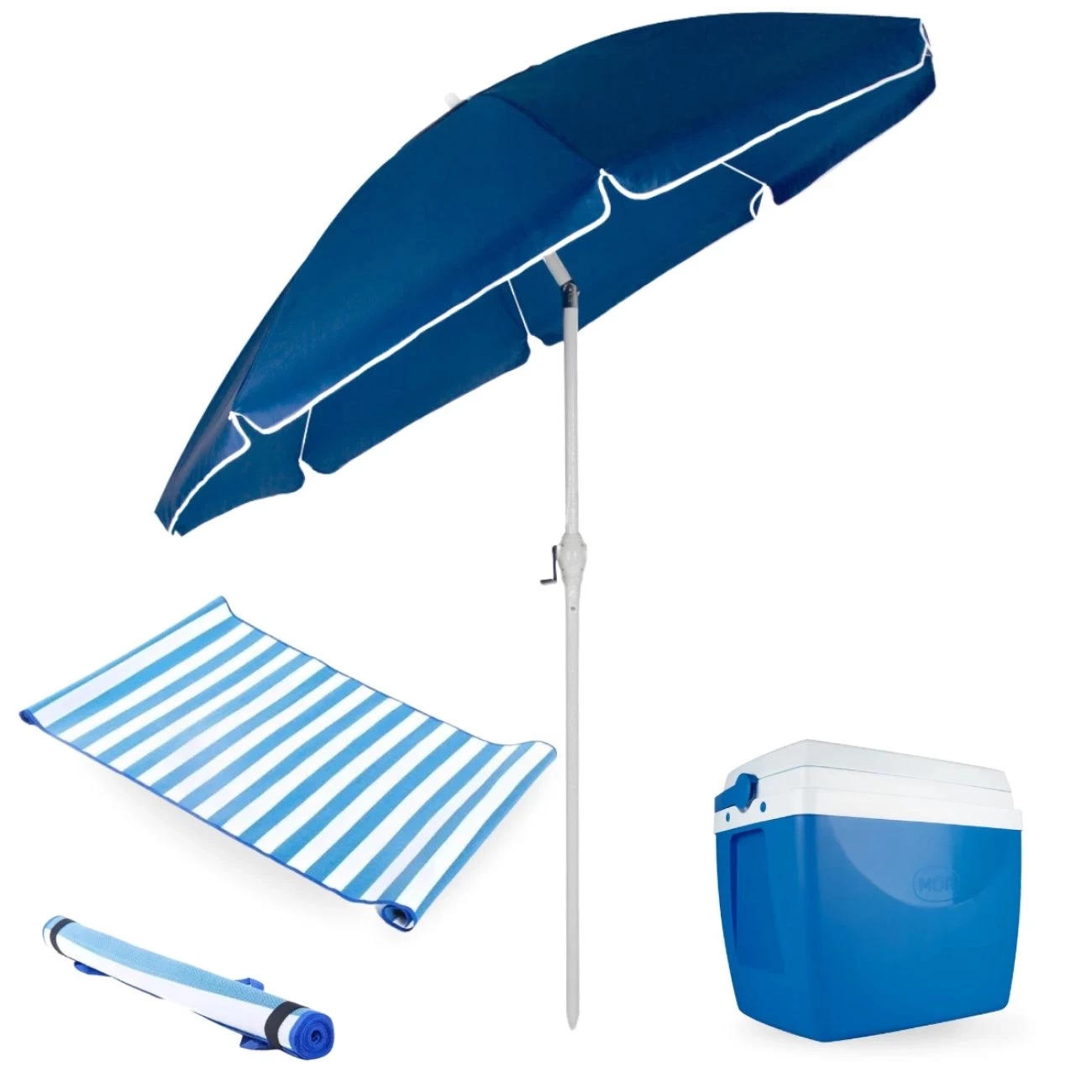 Kit Guarda-sol Articulado 2,50 M com Manivela + Esteira Praia + Caixa Térmica 34 L Piscina e Jardim
