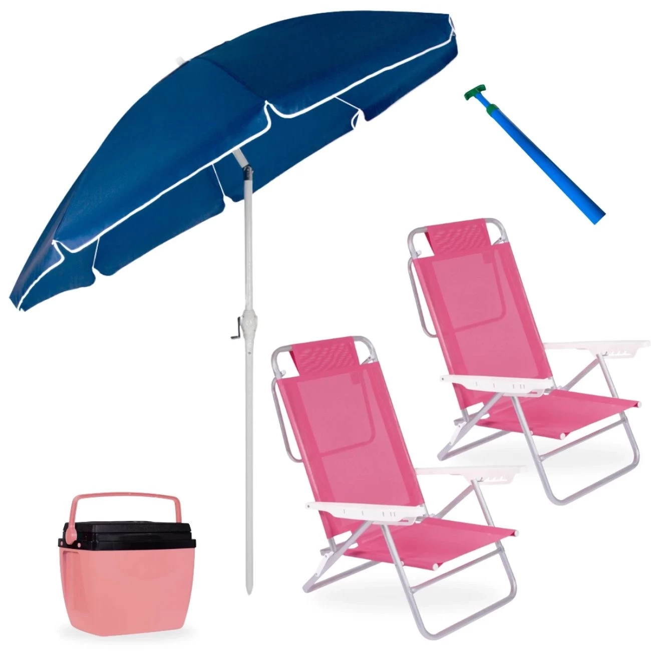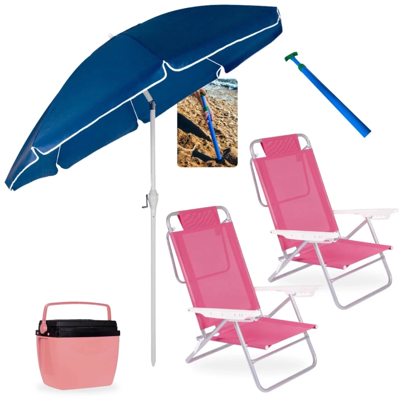 Kit Guarda Sol Articulado 2,50m + 2 Cadeiras Praia Reclinável + Caixa Térmica 18l Parque+ Saca Areia