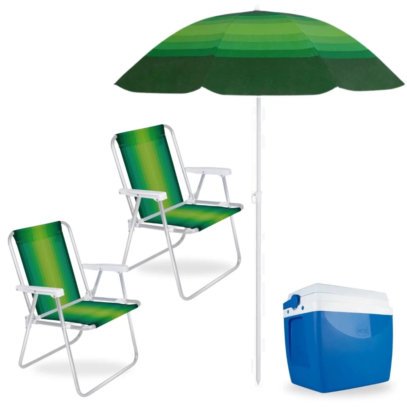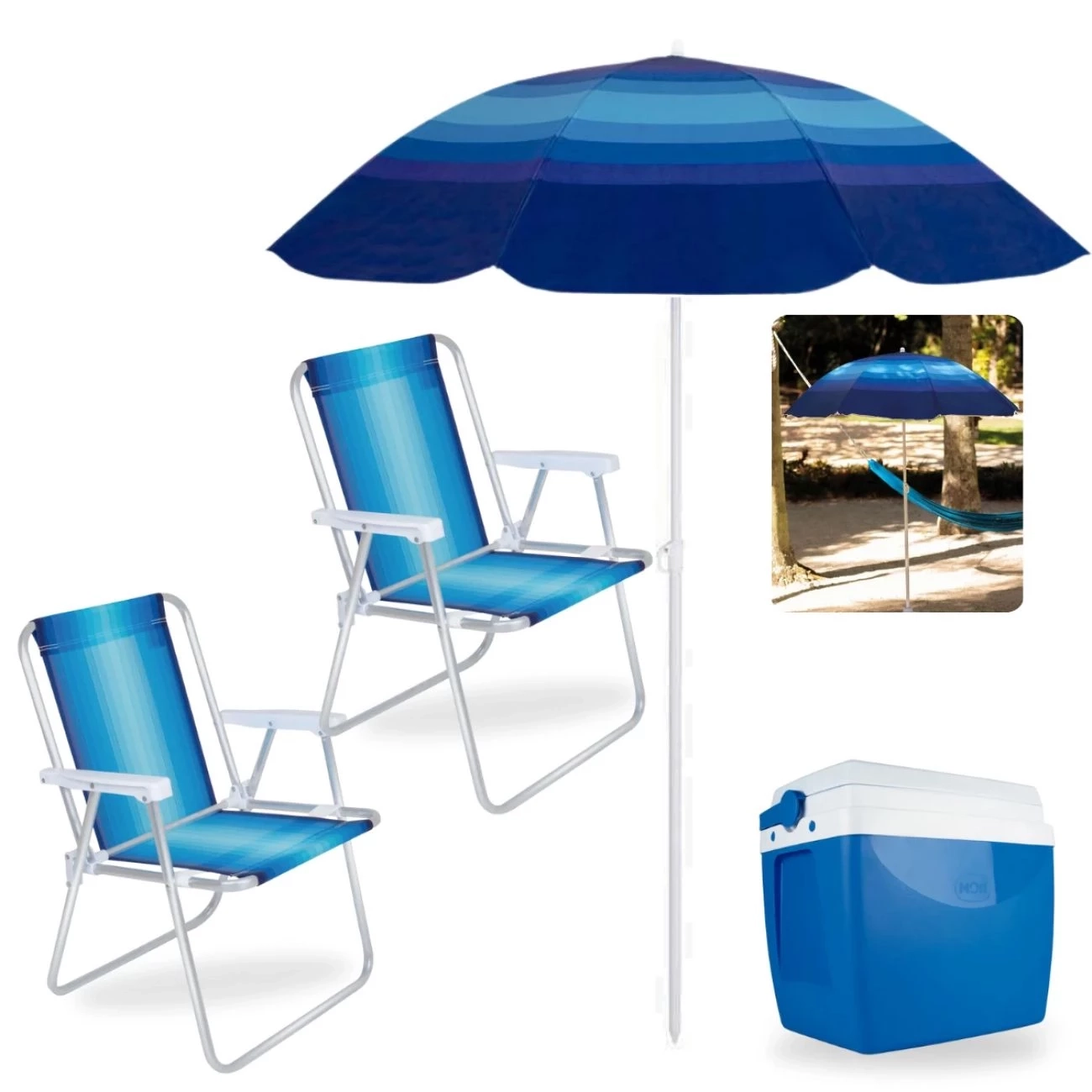 Kit Guarda Sol Fps 70 1,50 M + 2 Cadeiras de Praia Alta Alumínio + Caixa Térmica 26 L Parque Piscina