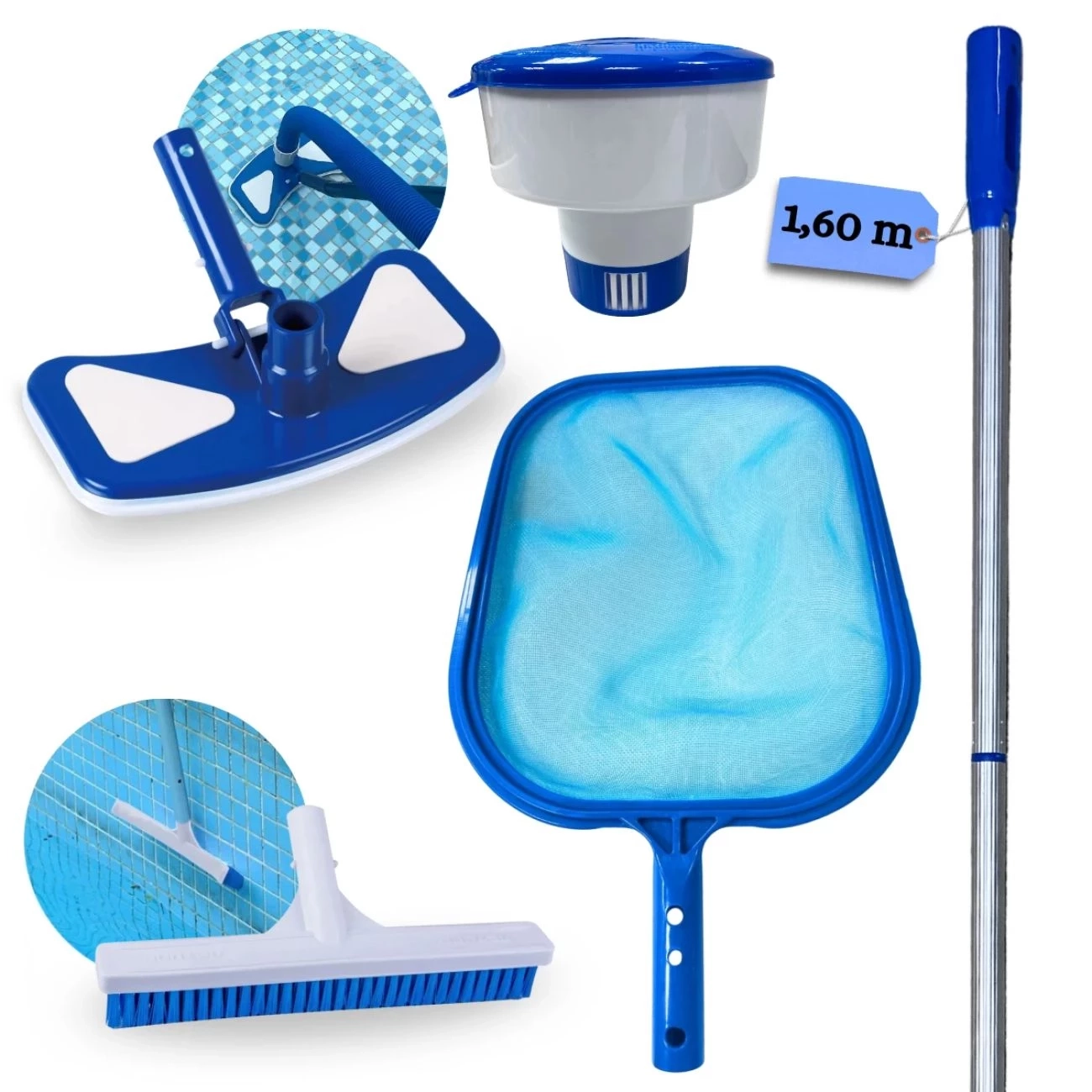 Kit Limpeza de Piscina Haste 1,60 M Desmontável + Aspirador + Escova Reta + Flutuador + Peneira