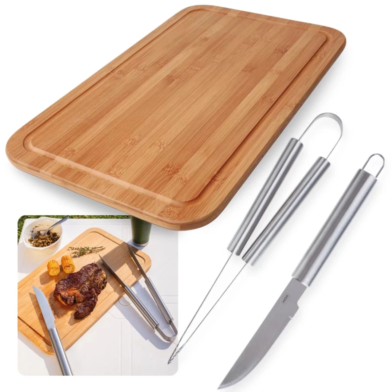 Kit para Churrasco 2 Peças Faca e Pegador em Aço Inox + Tábua de Carne 50cm em Bambu