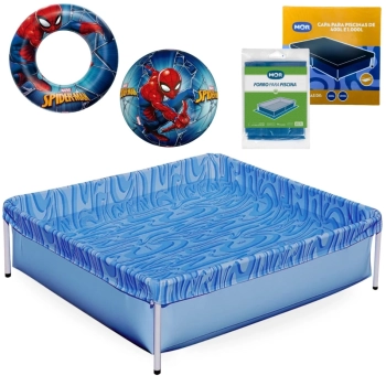 Kit Piscina Infantil 400 Litros Estrutural Mor + Capa, Forro + Boia e Bola Homem Aranha