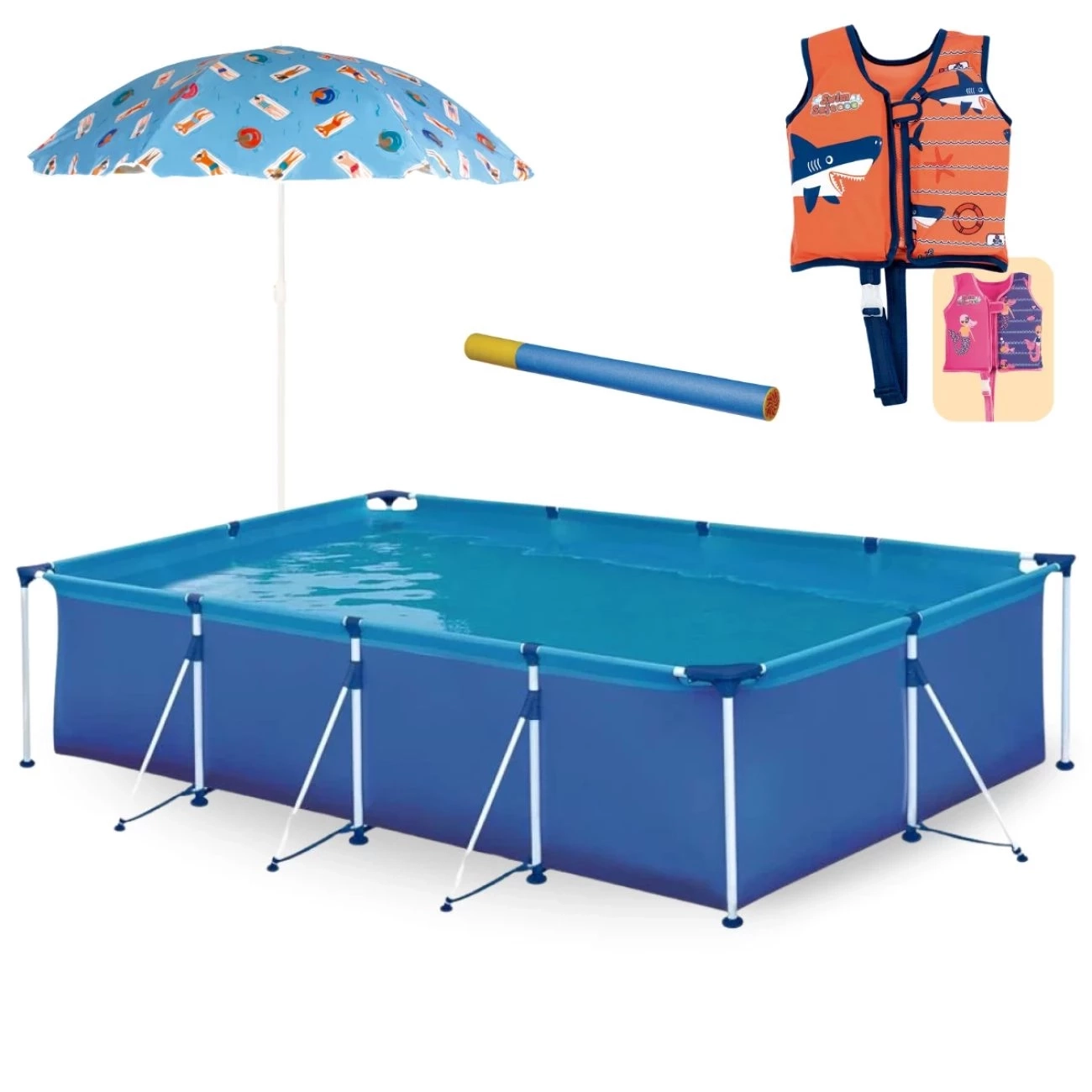 Kit Piscina Premium 6200 Lts de Armação + Colete P/M Infantil + Lança Água + Guarda Sol 1,30m