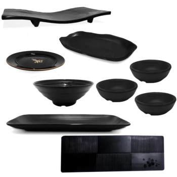 Kit Sushi 9 Peças Pratos Travessas e Molheiras Melamina Preto